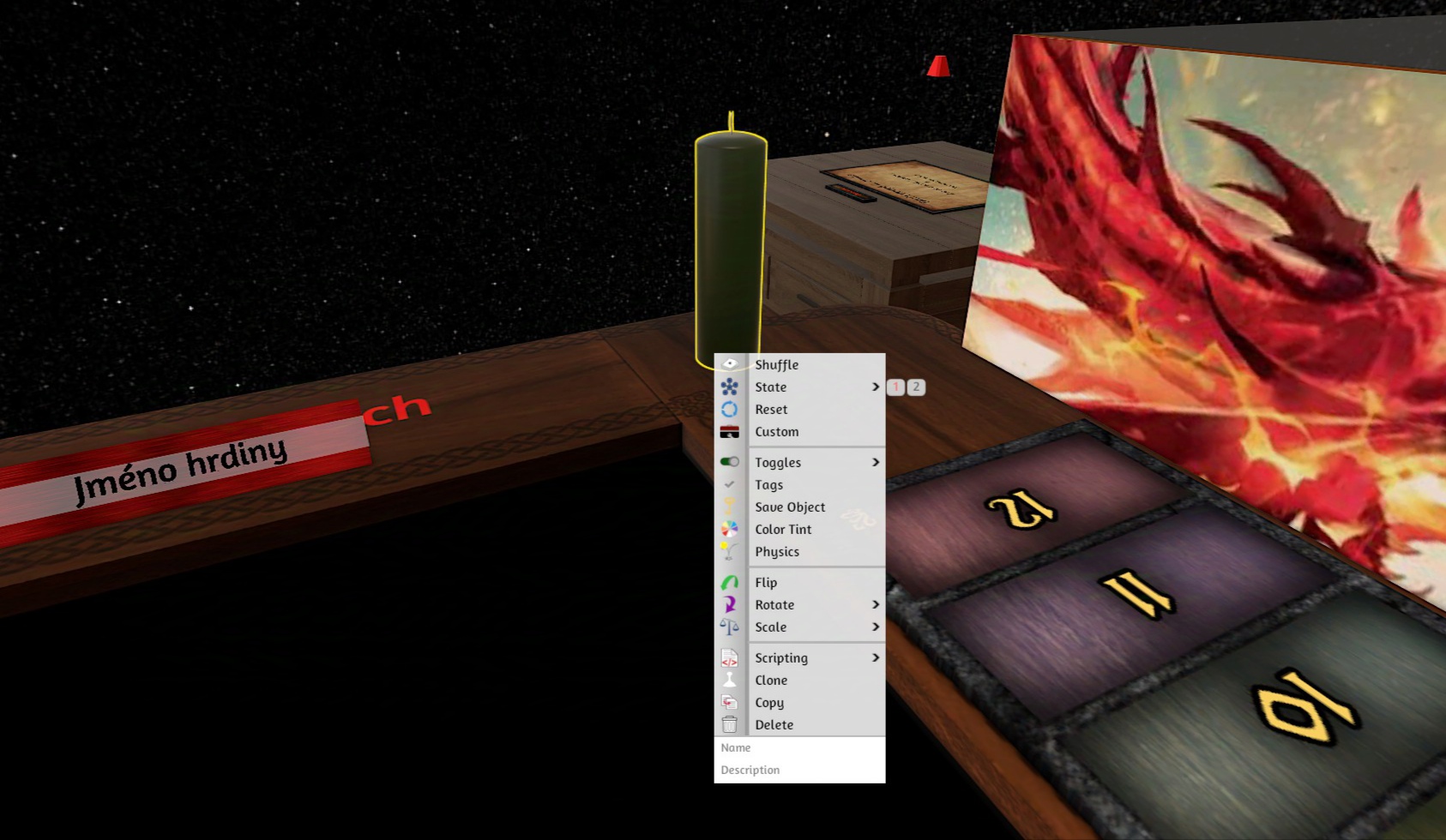 Hlavní panel: Pravým kliknutím myši na model svíčky se otevře její hlavní panel. Nyní najeďte na položku State a zvolte číslo 1 nebo 2. Červeně zvýrazněné číslo označuje její aktuální nastavení.